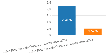 La provincia de Entre Ríos, que en diciembre de 2022 se encontraba entre las de menor tasa con un 0,57% (13 personas), mostró un alarmante y dramático incremento en diciembre de 2023, llegando a un 2,31% (57 personas). Este salto representa no solo una variación porcentual absoluta del +1,74% en la tasa provincial de encierro, sino un estremecedor crecimiento porcentual del 305,26% en la cantidad de personas alojadas en comisarías. Es un claro y preocupante ejemplo de cómo la problemática, lejos de resolverse, sigue profundizándose y agudizándose en esta jurisdicción. La indiferencia judicial y la falta de políticas efectivas hacen que esta situación se torne cada vez más crítica.