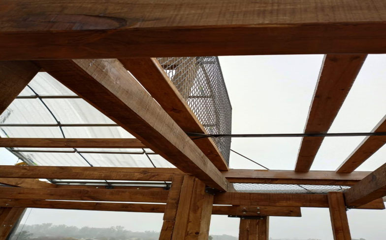 La elevación se realiza totalmente en madera de pino variedad elliotis o taeda misionera de bosques sustentables de 25 años, aproximadamente, de desarrollo.
