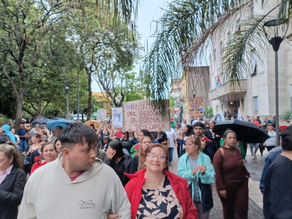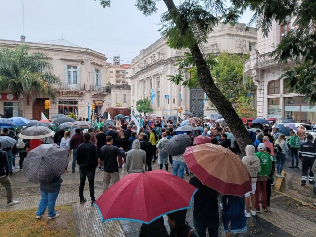 La imagen de la mañana en el centro de la ciudad fue elocuente: un vallado perimetral y efectivos policiales con equipos antimotines custodiando la sede de la Municipalidad de Concordia ante el creciente conflicto municipal. Bajo una persistente lluvia, el Sindicato de Empleados Municipales (UOEMC), junto a ATE y AGMER, encabezó una movilización para exigir la reincorporación de más de 140 trabajadores cuyos contratos no fueron renovados al inicio del año.