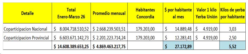En abril de 2025 publiqué en El Entre Ríos una nota en la que propuse medir la coparticipación que recibe Concordia en kilos de yerba por habitante. La intención era simple: sacar la discusión de las cifras millonarias y volverla comprensible con una referencia cotidiana. En aquel momento, el cálculo del primer trimestre de 2025 daba “casi seis kilos” por habitante por mes.