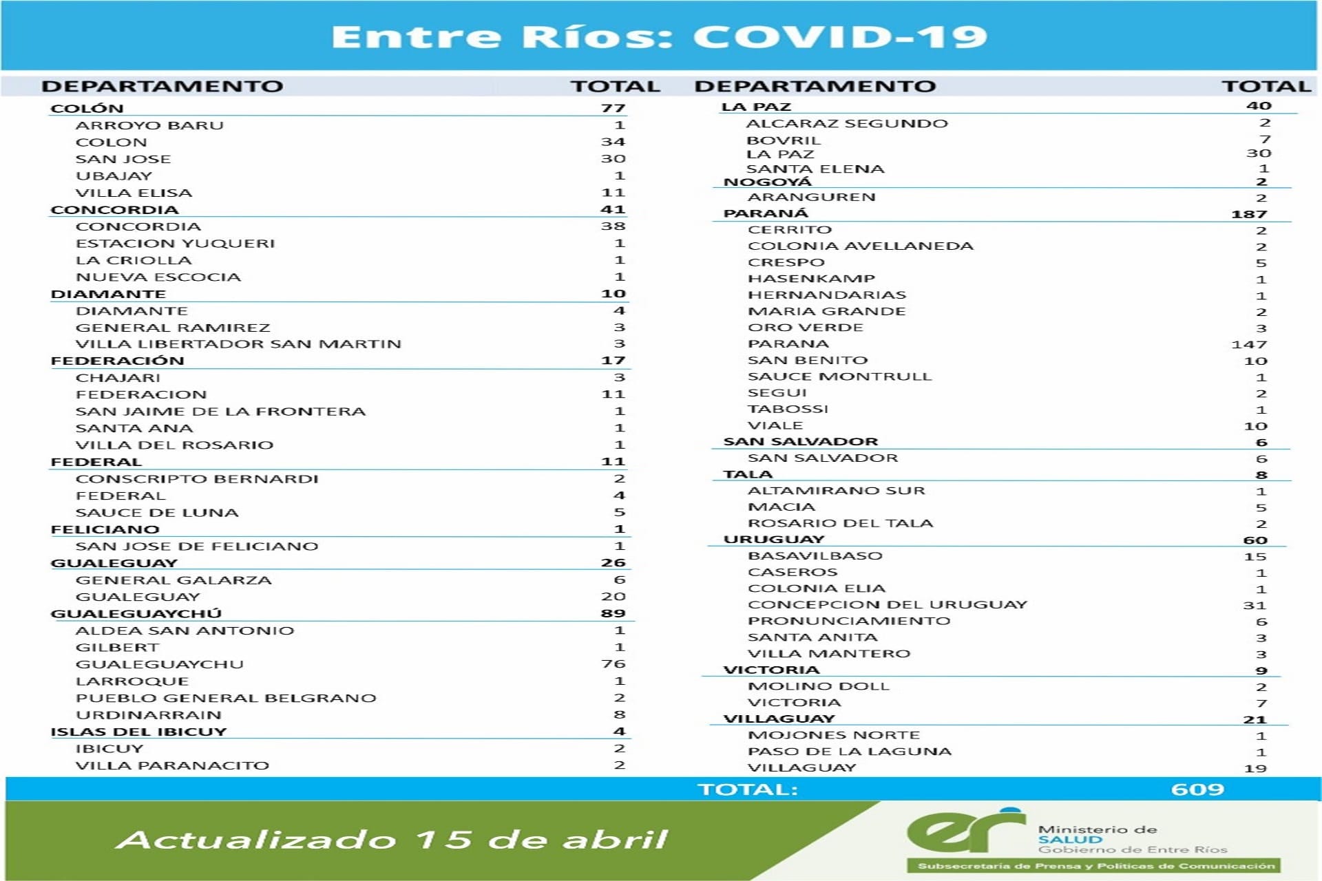 El área de Vigilancias Epidemiológica del Ministerio de Salud, confirmó que en Entre Ríos este jueves se registraron 609 nuevos casos de coronavirus.