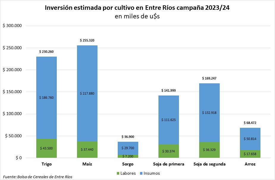 En este sentido, para la presente campaña, según señala el informe, entre los cinco principales cultivos, la provincia de Entre Ríos podría llegar a invertir entre labores e insumos unos U$S 902.200.000.