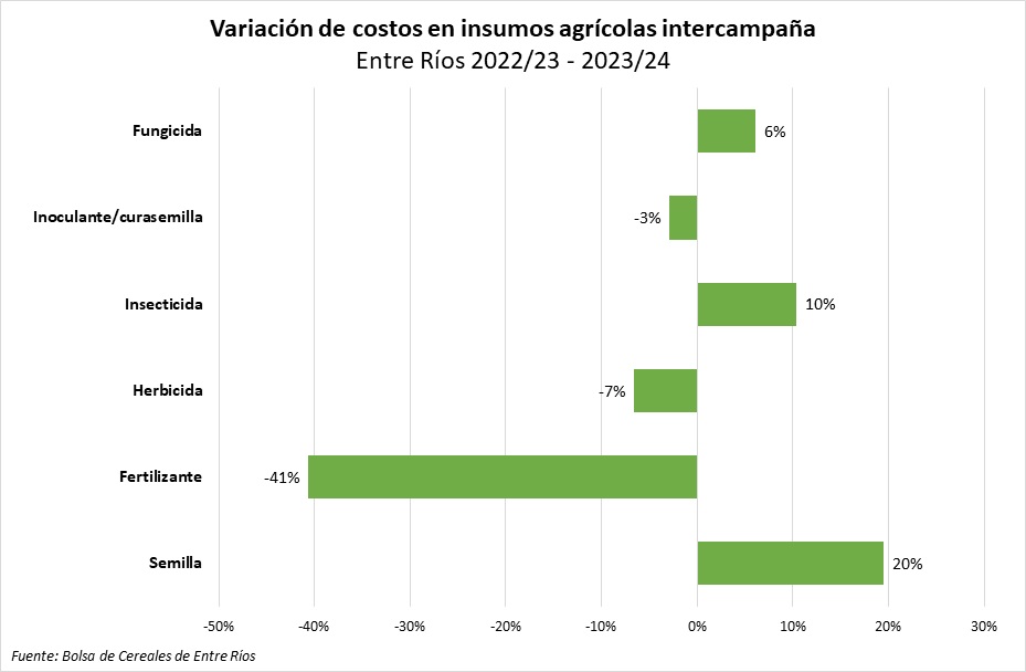 Dentro del ítem insumos, los fertilizantes presentaron una merma significativa en el precio; por el contrario, el costo de la semilla aumento su valor.