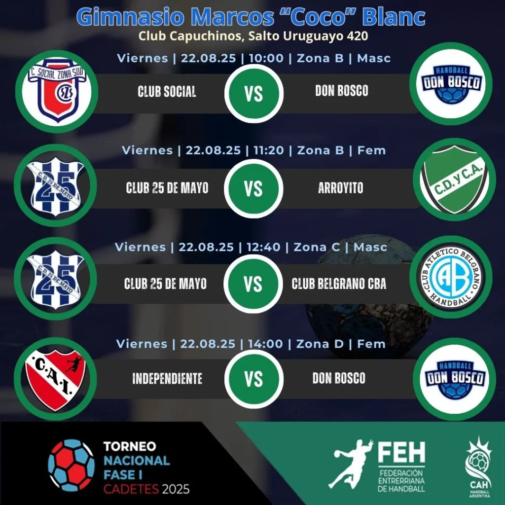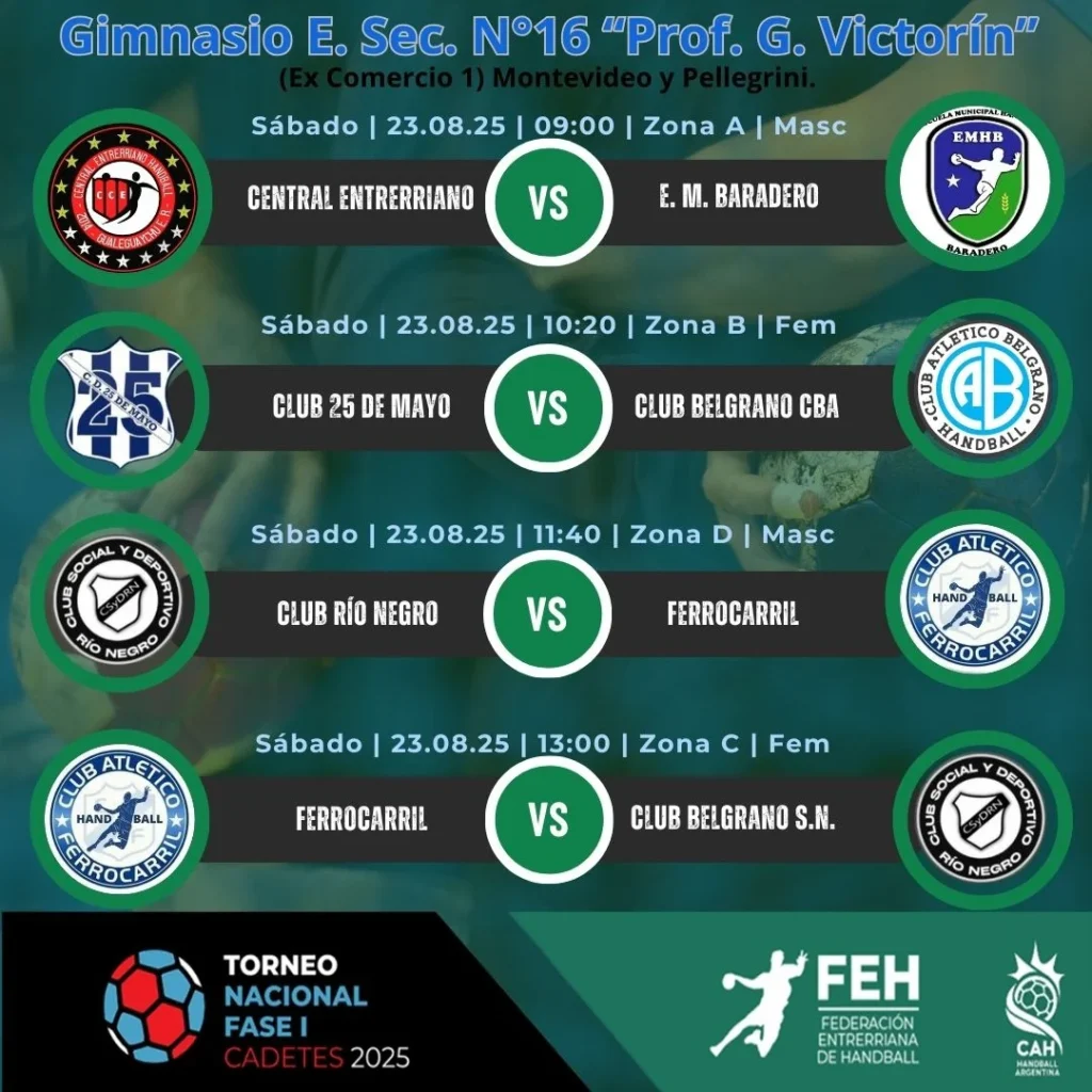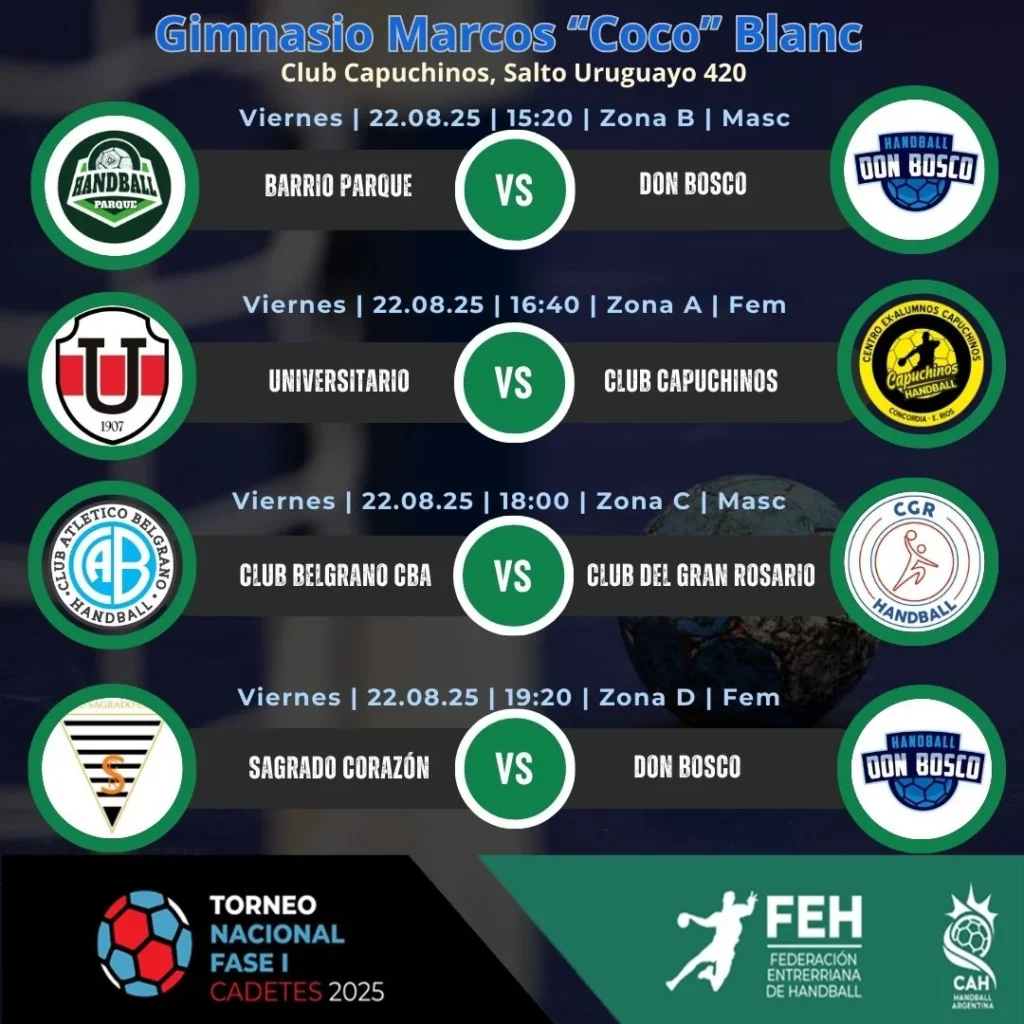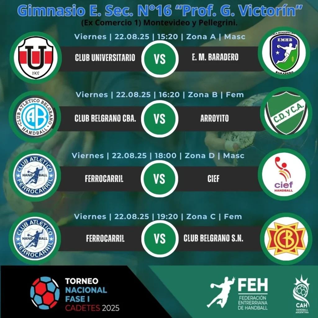 La jornada inaugural del viernes 22 de agosto promete emociones con encuentros clave. En el Gimnasio E. Sec. N°16 “Prof. G. Victorín”, el balonmano masculino abrirá la acción a las 10:00 con el enfrentamiento entre Central Entrerriano y Club Universitario por la Zona A. Posteriormente, a las 11:20, se disputará un partido femenino de la Zona A entre Municipalidad de Alta Gracia y Club Universitario. La tarde continuará con duelos como el de Río Negro contra CIEF por la Zona D masculina a las 12:40, y Río Negro frente a Club Belgrano S.N. por la Zona C femenina a las 14:00.