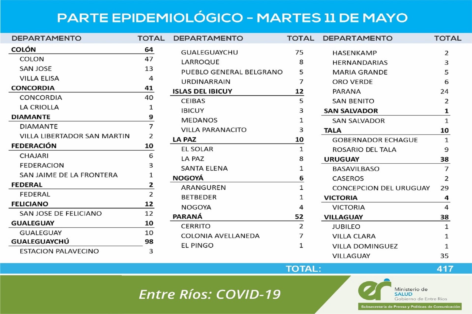 El área de Vigilancias Epidemiológica del Ministerio de Salud, confirmó que en Entre Ríos entre este martes se registraron 417 nuevos casos de coronavirus.