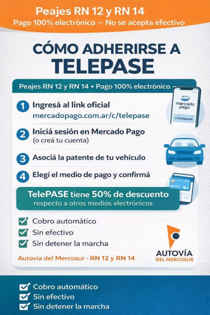 El peaje electrónico en las rutas 12 y 14 comenzará a operar exclusivamente con sistemas digitales desde el martes próximo, tras la firma del contrato prevista para este lunes 5 de enero entre Vialidad Nacional y Autovía Construcciones y Servicios S.A. El efectivo quedará completamente descartado en las estaciones de Zárate, Colonia Elía, Yeruá y Piedritas.