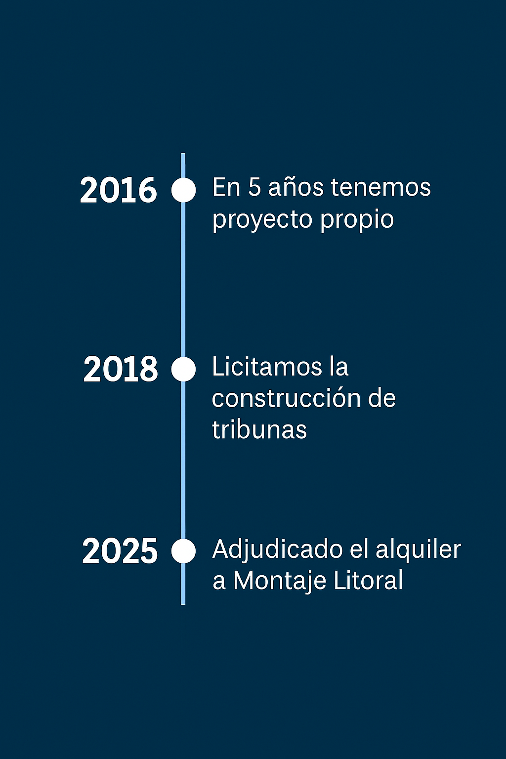 “Este anteproyecto es el objetivo final, no quiere decir que en un año lo vamos a tener, pero sí en 4 o 5 años”, aseguró Cresto en aquella conferencia de prensa. El objetivo declarado era claro: dejar de destinar sumas millonarias al alquiler de estructuras tubulares y capitalizar al municipio con obra propia. Hoy, a fines de 2025, el plazo de 5 años se ha duplicado y el sistema de alquiler continúa vigente.